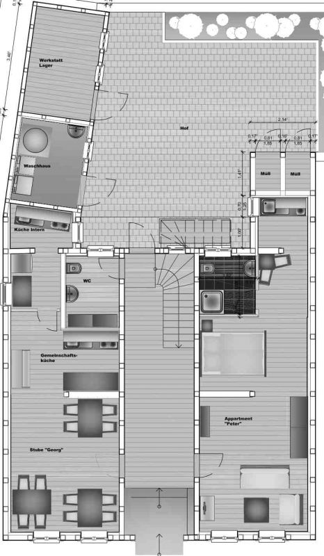 Ein-Raum-Wohnung "Peter" In Hochparterre befindet sich eine 40 m² große Wohnung für 1-2 Personen. Der Wohnraum ist eingerichtet mit Garderobe, Couch, Schreibtisch, Kommode mit TV und Bücherschrank. In der sich anschließenden Schlafnische stehen ein 1.40 m breites Bett mit Nachttisch und ein Kleiderschrank. Die kleine Küche wird durch einen angeschlossenen Essplatz komplettiert. Im Bad befinden sich eine Dusche, Waschbecken und WC. |