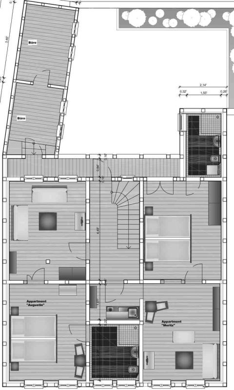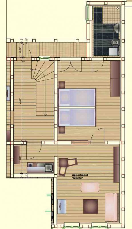 Zwei-Raum-Wohnung "Moritz" Im Obergeschoss befindet sich eine Wohnung für 1-3 Personen. Sie betreten die Wohnung durch eine Miniküche, die zum Wohnraum geöffnet ist. Dieser ist eingerichtet mit Essplatz, Couch, Laptoptisch und Kommode mit TV. Im Schlafzimmer finden Sie ein Doppel-Bett mit Nachttischen und einen geräumigen Kleiderschrank. Von dort aus gelangen Sie über eine Balkontür kleinen Loggia mit Blick in den Innenhof. Im Bad befinden sich eine Dusche, Waschbecken und WC. |