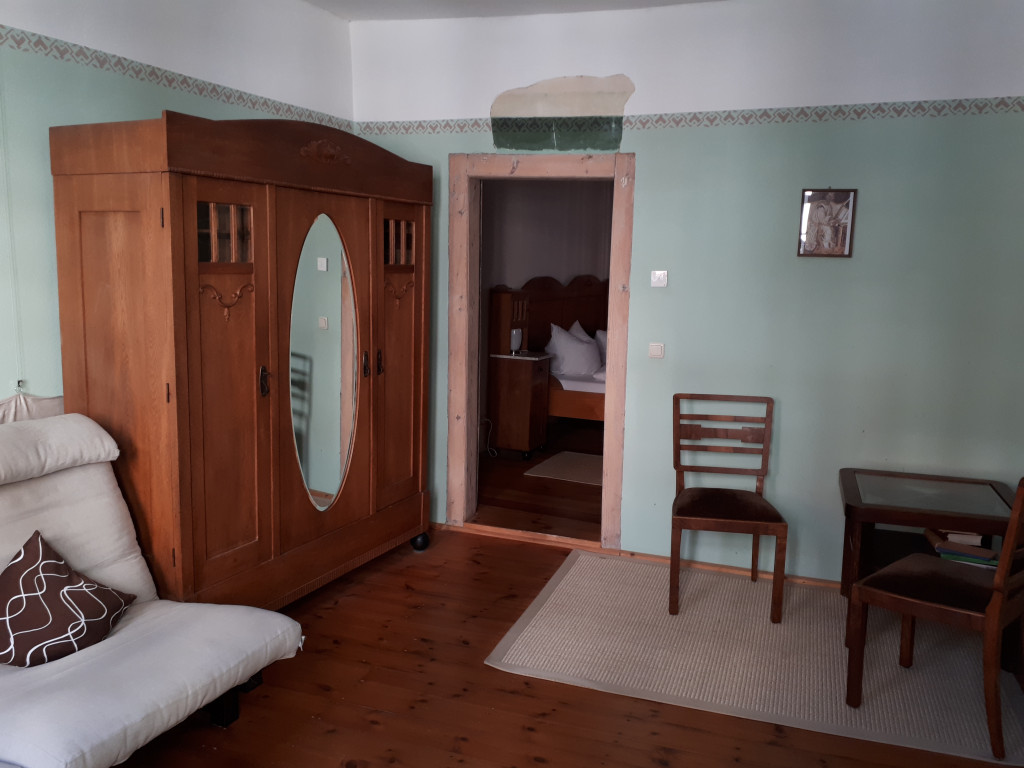 Das Duschbad mit Waschbecken +WC, ein zusätzliches WC mit Handwaschbecken und den Wohnraum mit TV teilen Sie mit Gästen von 1 EZ+1 DZ der Etage.